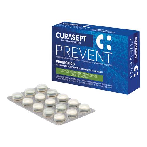 Assumere almeno una compressa di Curasept Prevent al giorno, da utilizzarsi assieme a Curasept Prevent Dentifricio e/o collutorio, per un mantenimento ottimale della salute orale e dei risultati della terapia del dentista. Durante la fase attiva delle terapie per le problematiche parodontali da parte del dentista (levigature radiolari e/o chirurgie gengivali), è consigliabile assumere almeno 2 compresse al giorno per tutta la durata del trattamento.