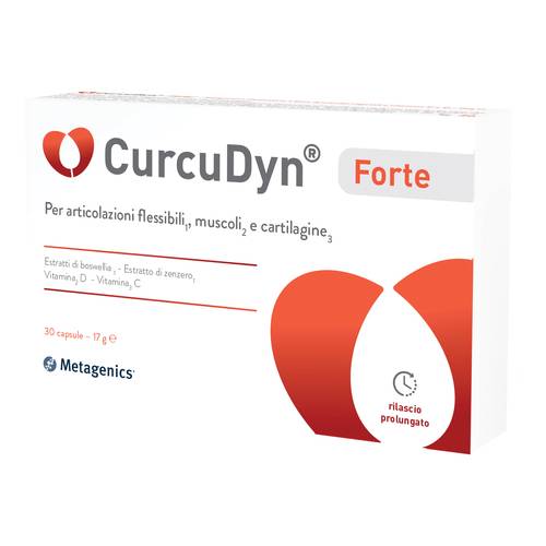 Integratore a base di curcumina e boswellia in una innovativa matrice di fieno greco, zenzero e vitamine per la salute di muscoli, ossa e per mantenere le articolazioni flessibili. L'innovativa tecnologia di produzione denominata "CBF Impact" permette di ottenere una forma di bio-ottimizzazione naturale, efficace e ben tollerata per due sostanze bioattive estremamente potenti: la curcumina e gli acidi boswellici. Grazie a "CBF Impact" Curcudyn Forte fornisce le due sostanze in una matrice amorfa di galattomannani da fieno greco. Questa tecnica mantiene e rafforza le proprietà degli estratti vegetali garantendo un rilascio più graduale nell'intestino con un ottimale profilo di sicurezza e tollerabilità. Grazie all'azione sinergica degli estratti vegetali e delle vitamine Curcudyn Forte aiuta a mantenere la salute di muscoli, ossa e la flessibilità delle articolazioni. La nuova formulazione migliora la compliance grazie alla mono somministrazione giornaliera.