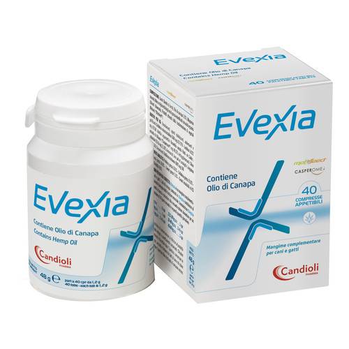 Mangime complementare per cani e gatti. L'olio di canapa contenuto in Evexia contribuisce al mantenimento fisiologico della funzione sensoriale.