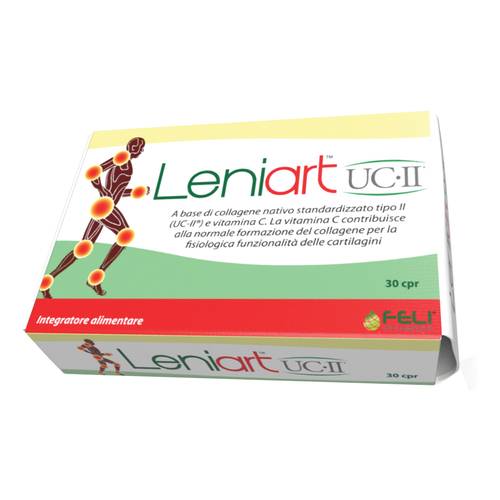Leniart UC•II Integratore alimentare utile nel mantenimento del trofismo di cartilagine e articolazioni. Il prodotto contiene collagene di ultima generazione, altamente concentrato, ossia un collagene di tipo II nativo (non denaturato) particolarmente biodisponibile. Una dose giornaliera di Leniart UC•II (40 mg di UC•II) preserva la funzionalità articolare, facilita il movimento, migliora la flessibilità e può permettere un allenamento più lungo e costante ritardando la comparsa di disturbi articolari.