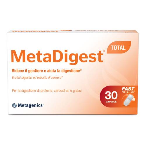 Integratore di enzimi per favorire la digestione di proteine, carboidrati e grassi. MetaDigest Total è un integratore a base di enzimi digestivi di origine non animale e quindi adatto anche a consumatori vegetariani o vegani. Esso contiene una miscela bilanciata di enzimi per la digestione delle proteine, dei grassi e dei carboidrati normalmente presenti in un pasto completo. La presenza di lecitina aiuta ad emulsionare i grassi e la presenza di fitasi favorisce la degradazione dei fitati presenti in una dieta ricca di vegetali che possono contrastare l'assorbimento di alcuni micronutienti. Gli enzimi di MetaDigest total funzionano indipendentemente dal pH e quindi già nello stomaco. La formulazione di MetaDigest total contiene anche estratto secco di zenzero in grado di supportare la funzione digestiva.