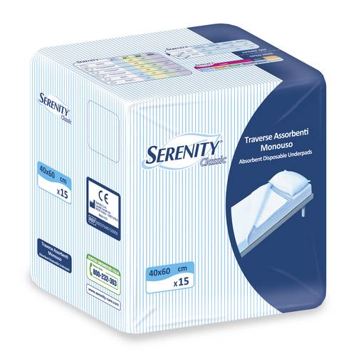 SERENITY Classic Dispositivo medico CE. Traversa assorbente monouso adatta non solo per il letto ma anche per tutte quelle superfici che occorre proteggere. La Traversa Serenity è facile e pratica da utilizzare, basta distenderla. La sua struttura è costituita da uno strato di cellulosa accoppiato con un morbido strato di tessuto non tessuto e con un rivestimento esterno in polietilene antiscivolo che forma una valida barriera al passaggio dei liquidi.